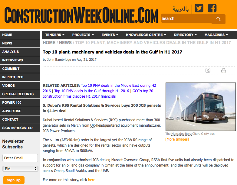 RSS’ $11mn purchase of more than 300 diesel generators from JCB Power Products has been listed in the top 10 plant, machinery and vehicle deals done in the GCC during 2017 to date.